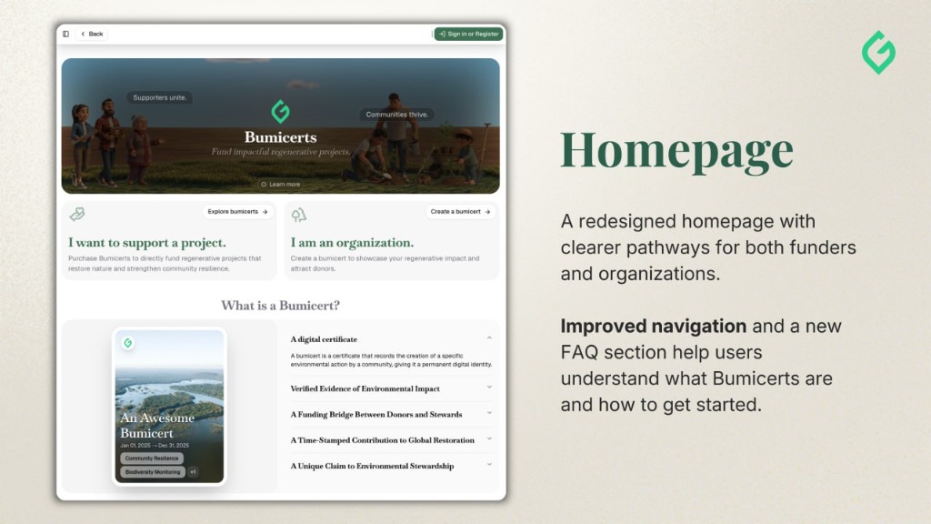 Improved navigation and a new FAQ section help users understand what Bumicerts are and how to get started.