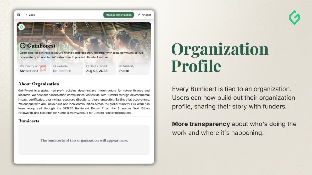 Every Bumicert is tied to an organization. Users can now build out their organization profile, sharing their story with funders.