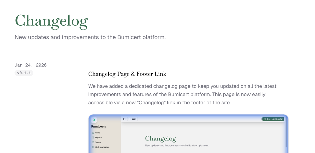We have added a dedicated changelog page to keep you updated on all the latest improvements and features of the Bumicert platform. This page is now easily accessible via a new "Changelog" link in the footer of the site.